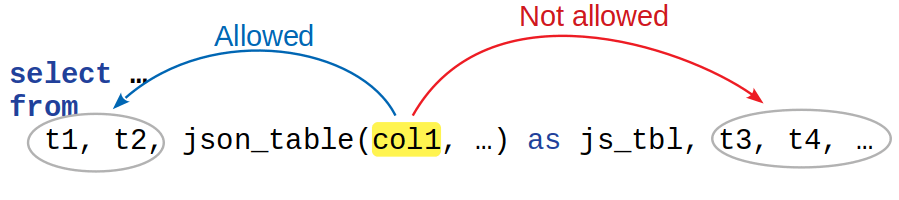 Fortunately for the optimizer, there are some syntactic restrictions about JSON_TABLE’s argument that prevent one from creating complex and/or invalid dependencies with use of JSON_TABLE.